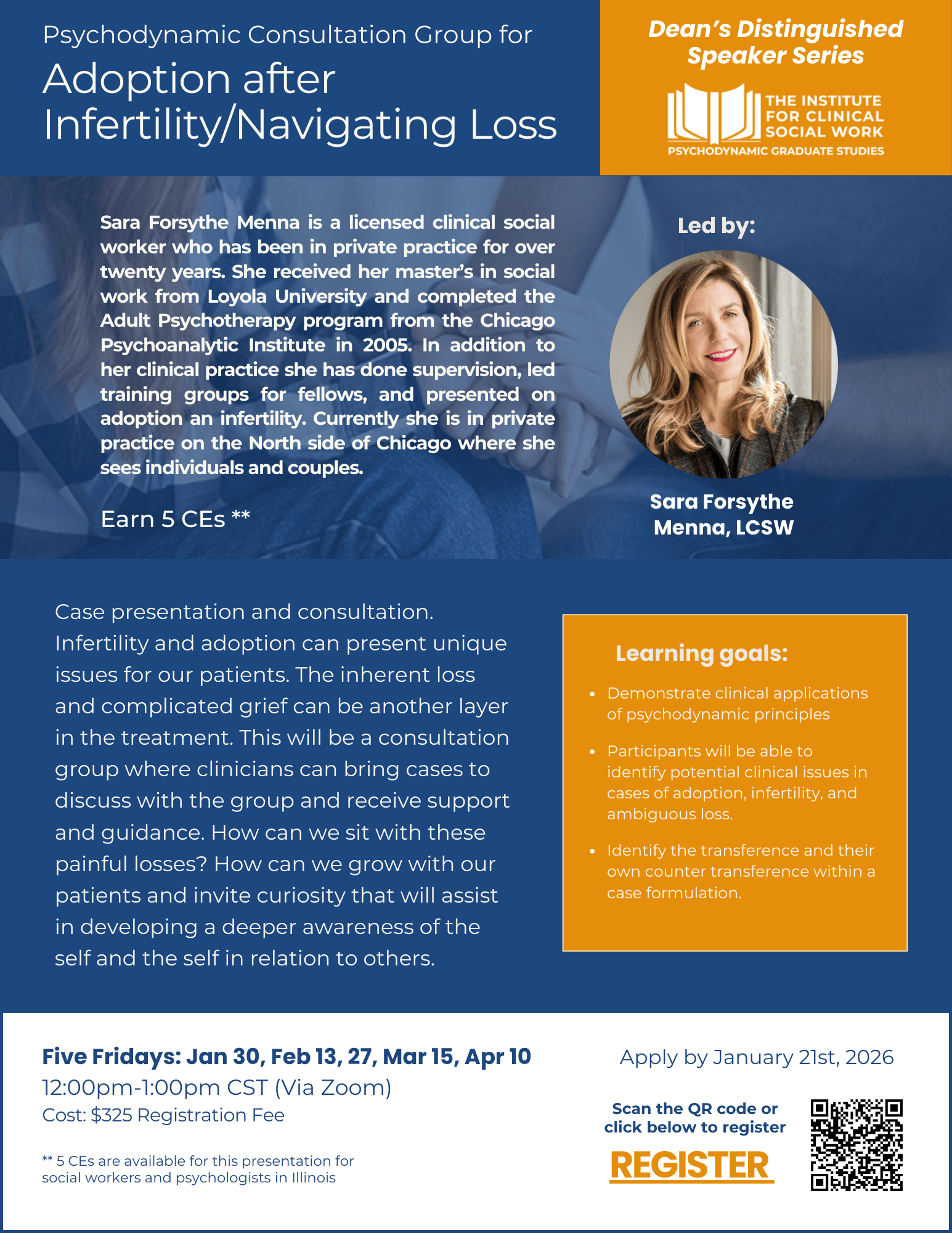 Adoption after Infertility/Navigating Loss: Friday, January 30, 2026 12:00 PM 1:00 PM Google Calendar ICS Contact Elree C. Smith with questions: esmith@icsw.edu register