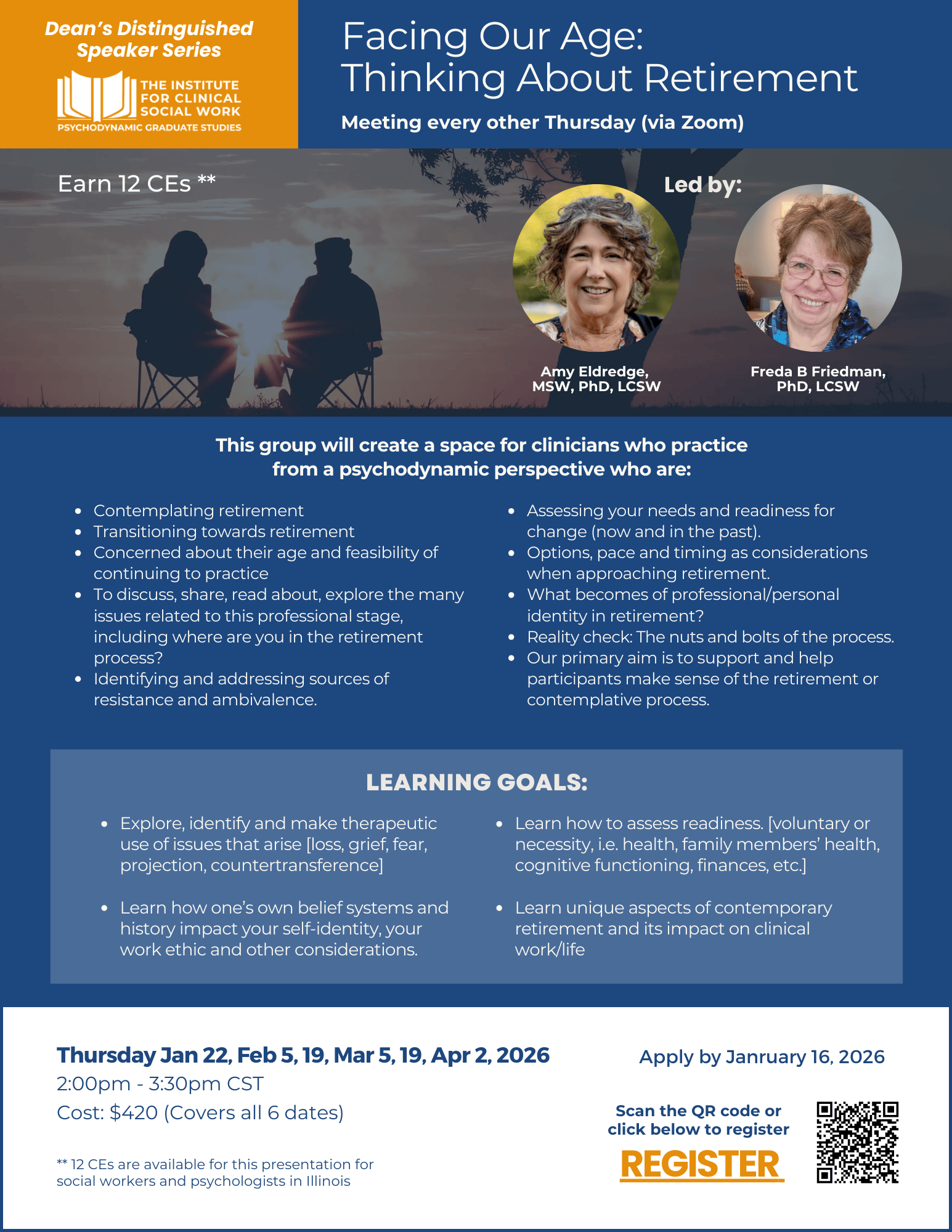 Facing Our Age: Thinking About Retirement Thursday, January 22, 2026 2:00 PM 3:30 PM Google Calendar ICS Contact Elree C. Smith with questions: esmith@icsw.edu register