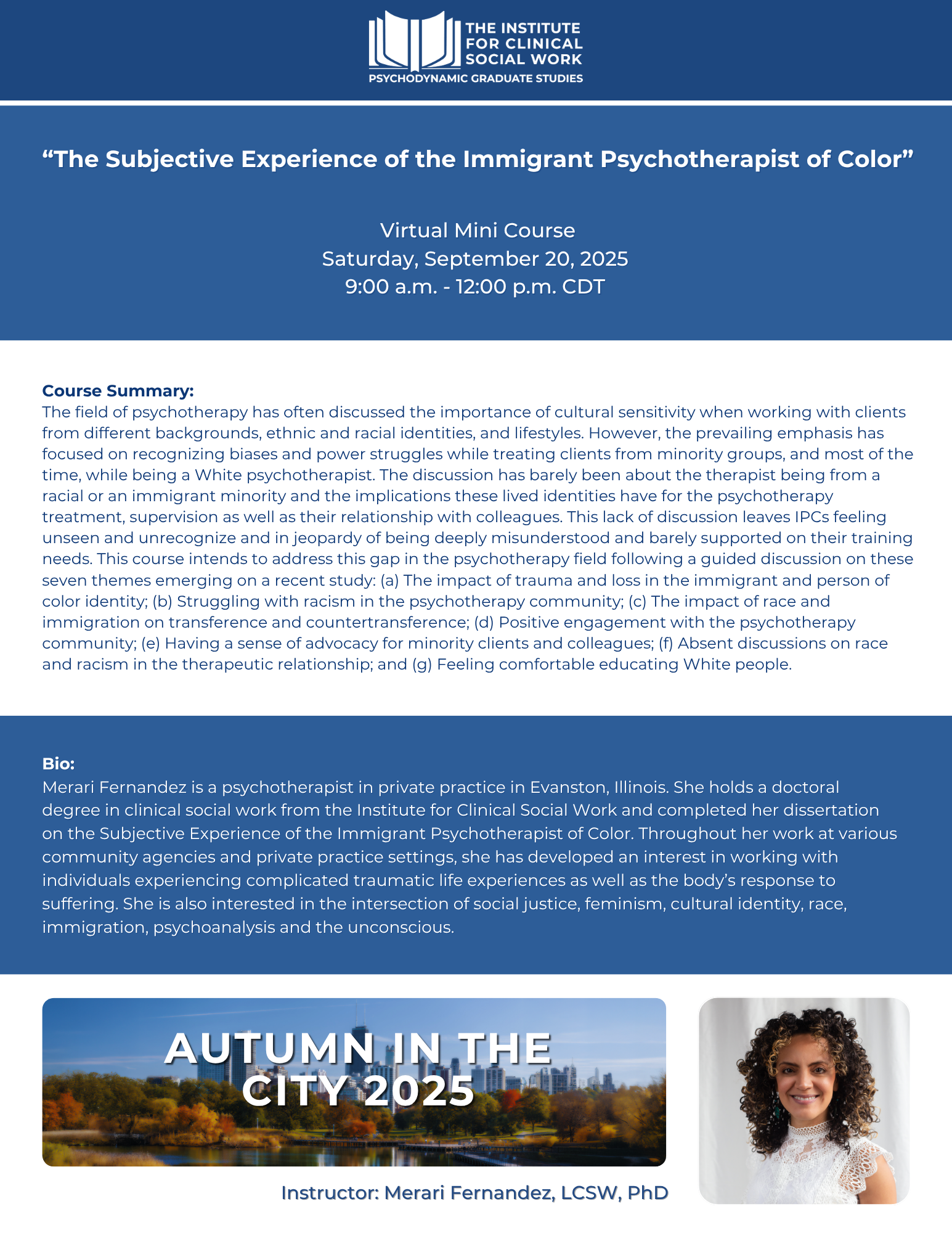 2025 Autumn In The City Saturday, September 20, 2025 9:00 AM 12:00 PM THE INSTITUTE FOR CLINICAL SOCIAL WORK 1345 West Argyle Street Chicago, IL, 60640 United States (map) Google Calendar ICS Contact Elree C. Smith with questions or for community link: esmith@icsw.edu register