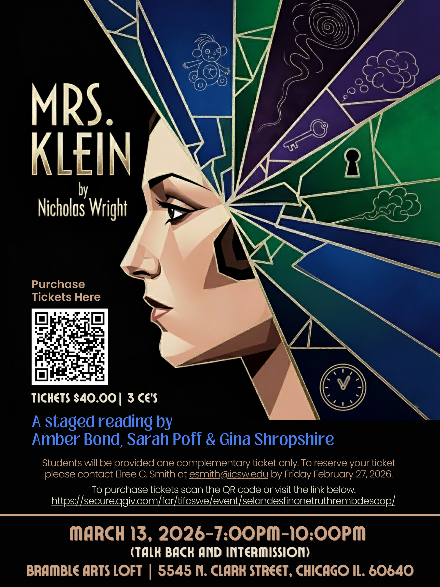 Mrs. Klein by Nicholas Wright - A Gripping Drama of Psychoanalysis and Family Secrets Friday, March 13, 2026 7:00 PM 10:00 PM Bramble Arts Loft 5545 North Clark Street Chicago, IL, 60640 United States (map) Google Calendar ICS Contact Elree C. Smith with questions: esmith@icsw.edu register