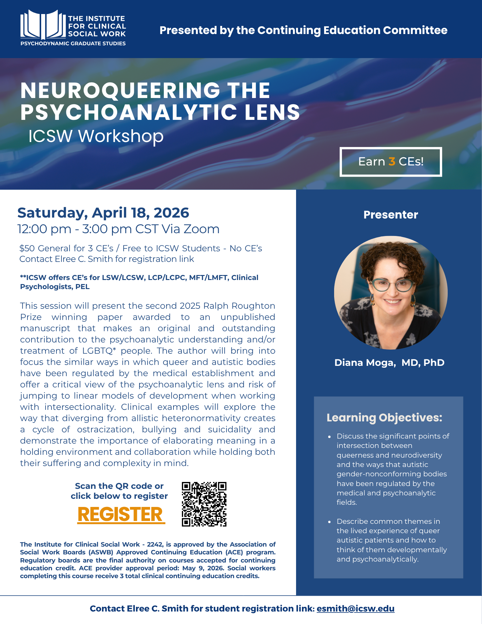 Neuroqueering the Psychoanalytic Lens Saturday, April 18, 2026 12:00 PM 3:00 PM Google Calendar ICS Contact Elree C. Smith with questions: esmith@icsw.edu register register