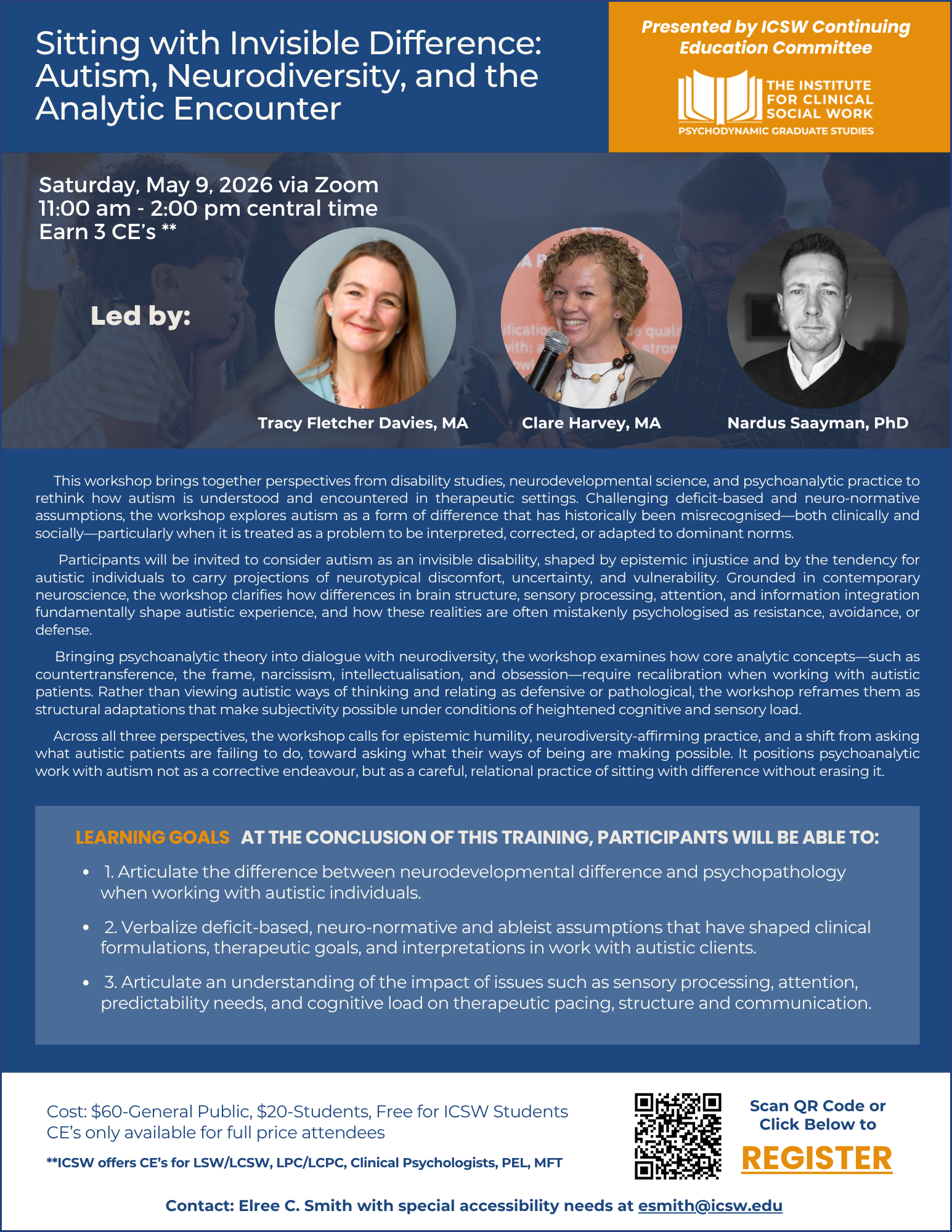 Sitting with Invisible Difference: Autism, Neurodiversity, and the Analytic Encounter Saturday, May 9, 2026 11:00 AM 2:00 PM Google Calendar ICS Contact Elree C. Smith with questions: esmith@icsw.edu register