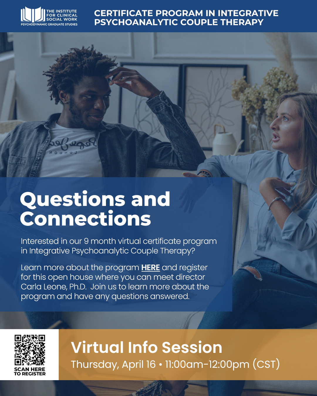 The Institute for Clinical Social Work's (ICSW) couple therapy certificate program focuses on psychoanalytic theory to help therapists of all types. Led by three preeminent therapists, it offers specialized training and support beyond that offered in most graduate school programs. Join our upcoming open house, hosted by the Program Director, Dr. Carla Leone, to learn more about this virtual certificate program.